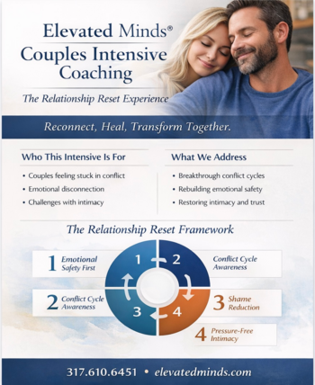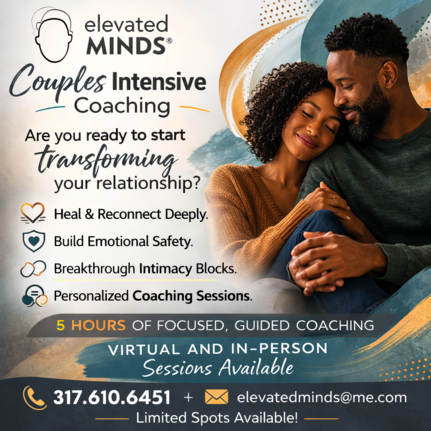 The Elevated Minds® Couples Intensive Coaching program provides a safe and structured space where couples can slow down, better understand the patterns shaping their relationship, and begin rebuilding emotional safety, communication, and closeness.